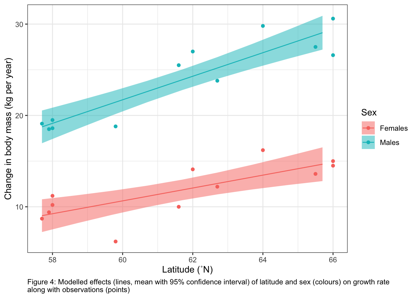 Figure 4 shows the modelled effects of latitude and sex on growth rate along with my observations.
