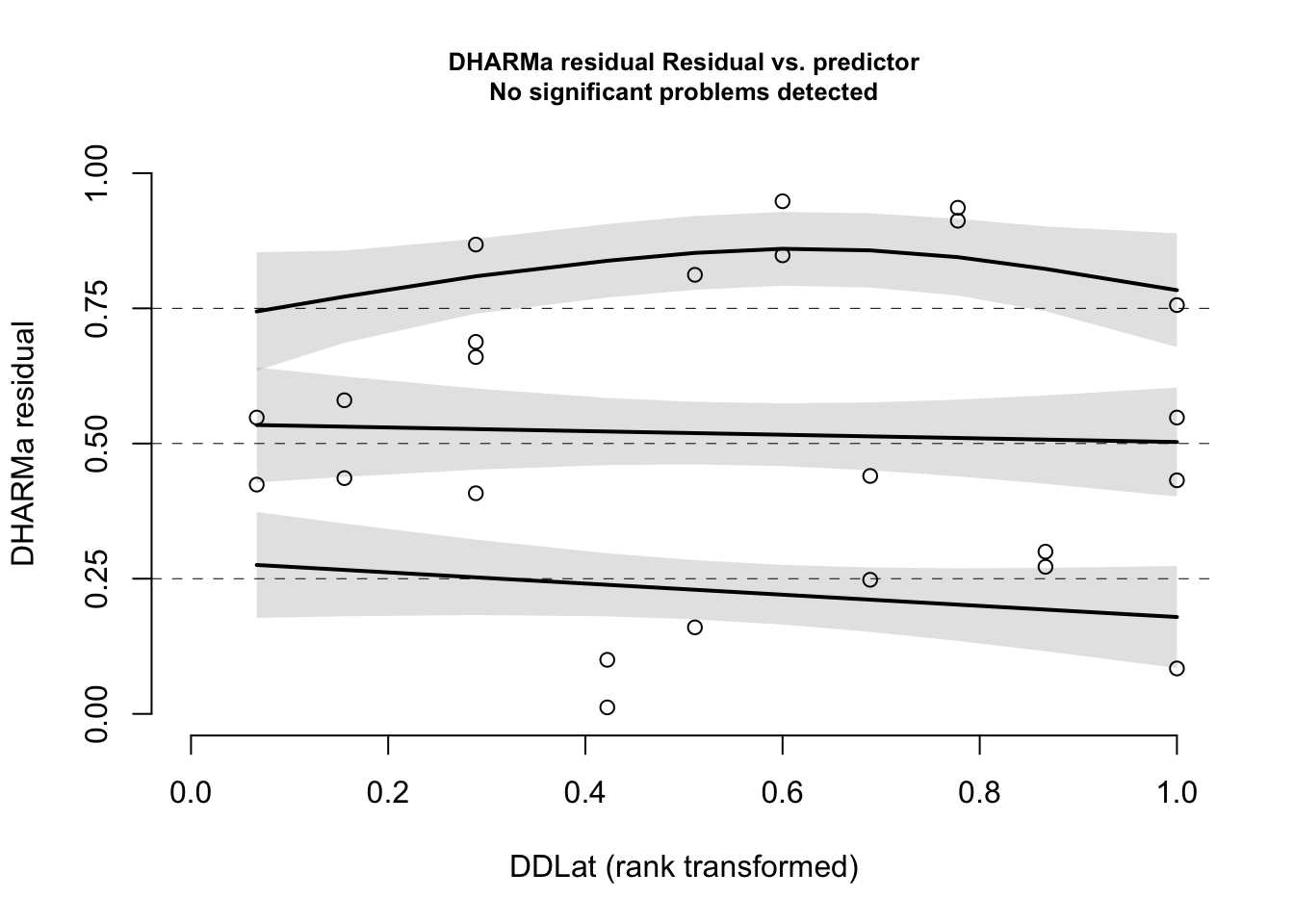 The remaining unexplained deviance may be due to other factors affecting growth rate such as winter harshness, food availability, etc. Note that I was not able to include minimum winter temperature in my hypothesis test due to high collinearity between latitude and minimum winter temperature. Therefore, I do not know if the measured latitudinal effect on growth might mechanistically be due to winter harshness (here estimated as minimum winter temperature). This could be tested if I was able to expand my data set to include sites where latitude and minimum winter temperature were less correlated… [discussion on other, untested factors that may be responsible for the unexplained deviance].