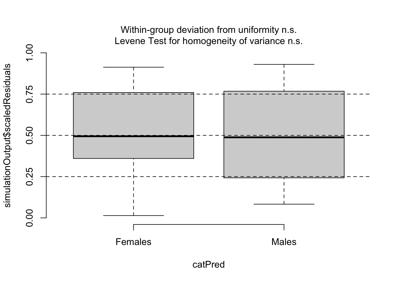 Growth rate is higher for males than females: the predicted growth when latitude is 61.6˚N (the mean of the latitudinal range) is 11.8 ± 0.6 kg year-1 for females and 23.8 ± 0.6 kg year-1 for males.. There is evidence the predictions of growth between sexes are different (t-test; t-ratio = -14.8; P < 0.0001). Note that these estimates are the same on the link and response scales as the model uses an identity link.