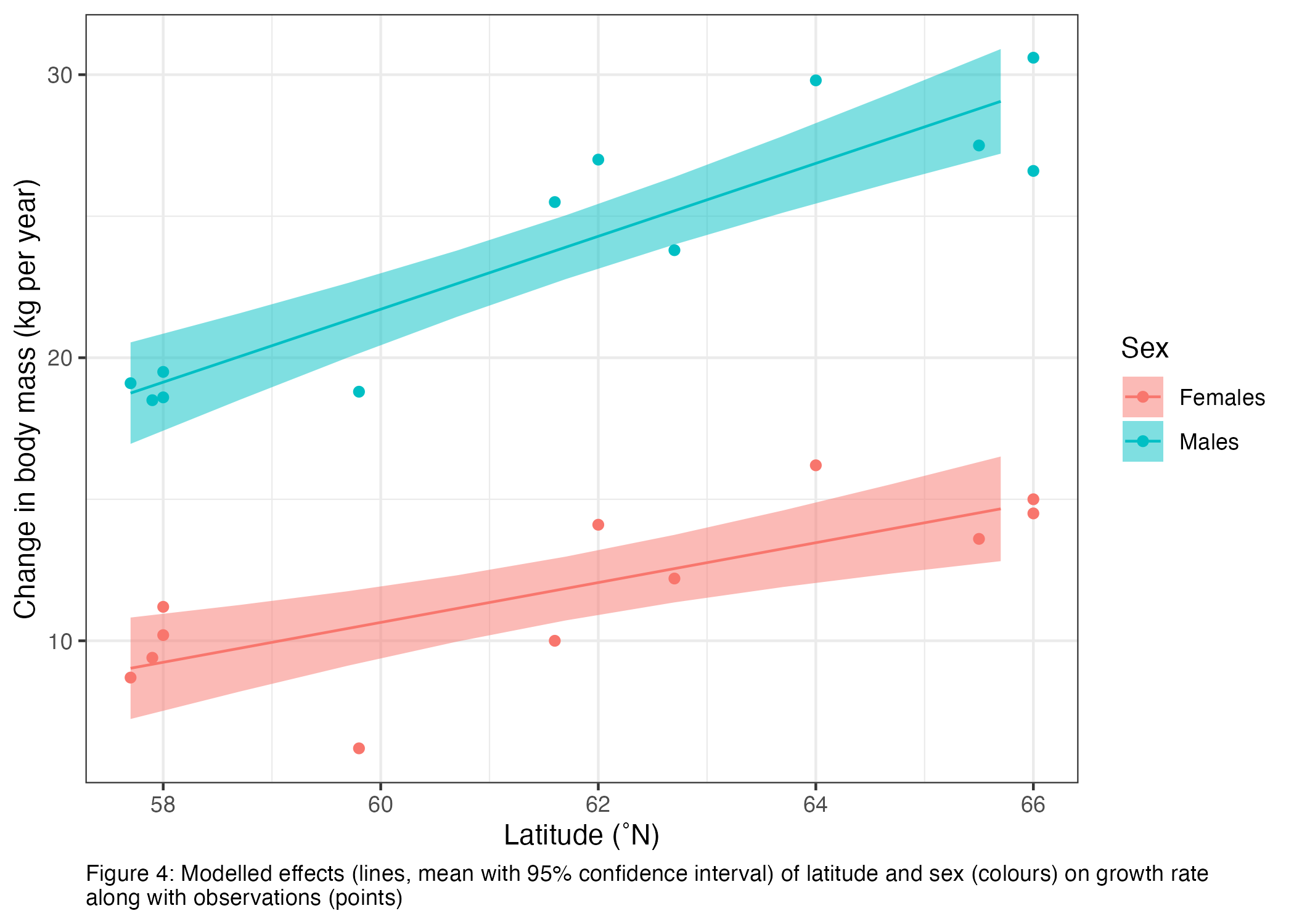 Growth rate is higher for males than females: the predicted growth when latitude is 61.6˚N (the mean of the latitudinal range) is 11.8 ± 0.6 kg year-1 for females and 23.8 ± 0.6 kg year-1 for males.12. There is evidence the predictions of growth between sexes are different (t-test; t-ratio = -14.8; P < 0.0001). Note that these estimates are the same on the link and response scales as the model uses an identity link.