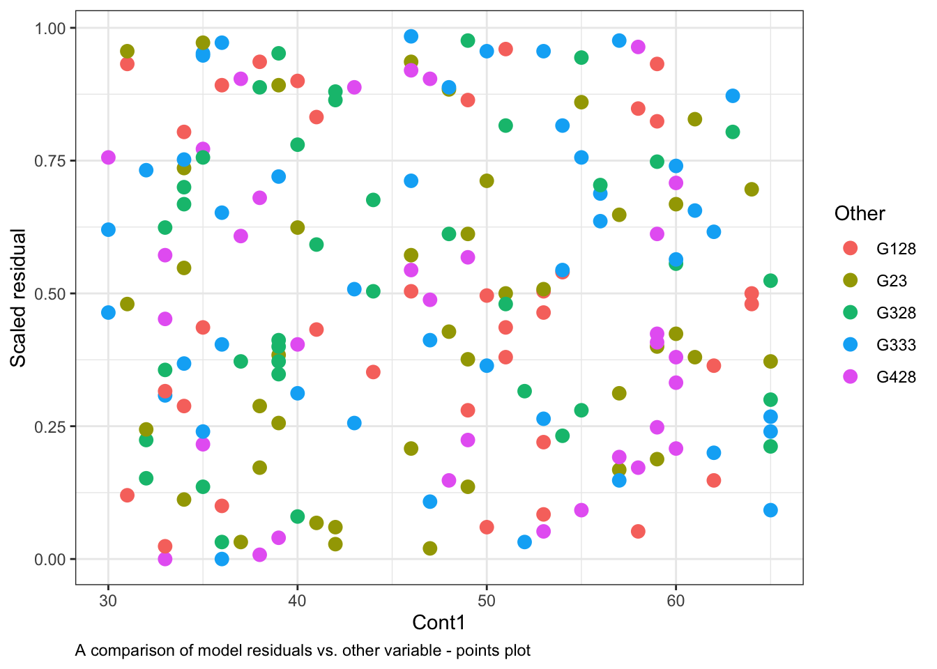 plotResiduals(simOut, # the object made when estimating the scaled residuals. See section 2.1 aboveform = myDat$Cont1) # the variable against which to plot the residuals. When form = NULL, we see the residuals vs. fitted values