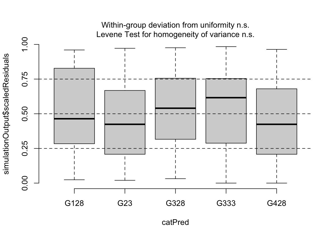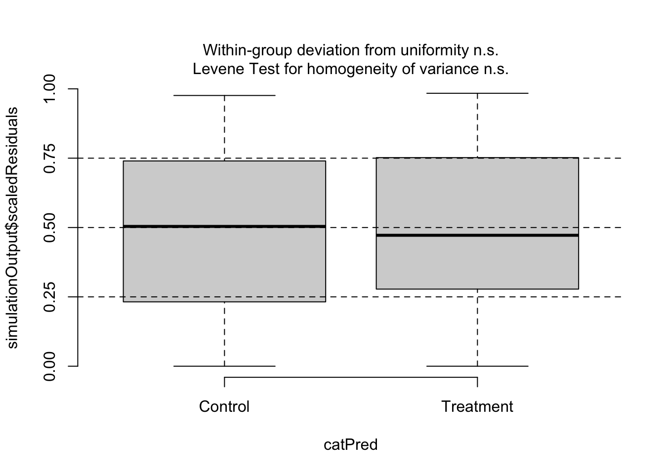 In this last figure, you get boxplots showing the distribution of the residuals - one for each level of your categorical predictor. This different picture is because the predictor Cat is categorical. Instead of a uniform cloud, you look for boxplots that spread across the 0.25 and 0.75 quantiles. If the spread is wide and even across the levels of your categorical predictor, you have evidence the model is well-specified to test your hypothesis. DHARMa also includes a Levene Test that tests if the variance across the levels in your categorical predictor are similar. If they are different, the Levene Test will be flagged in red with a p-value < 0.05.