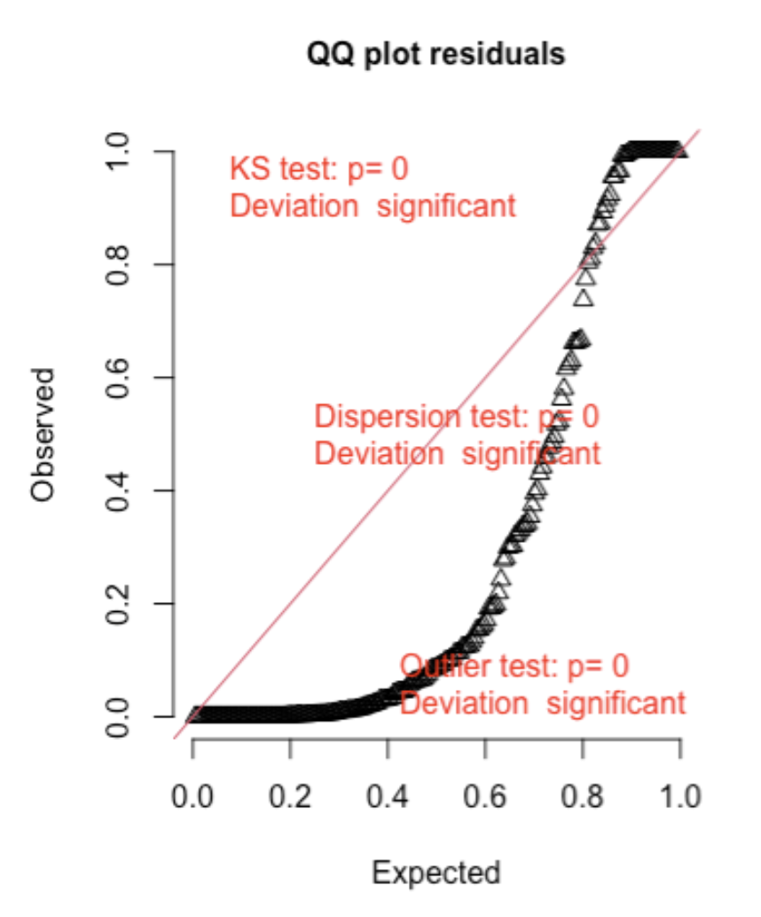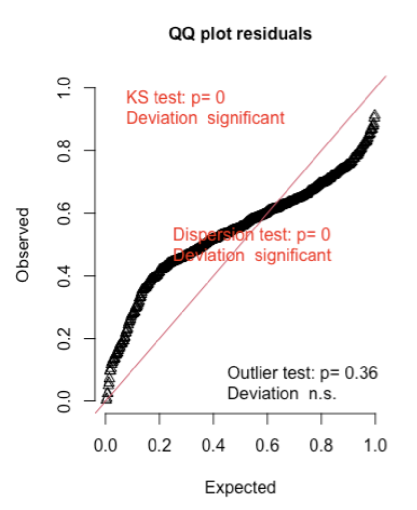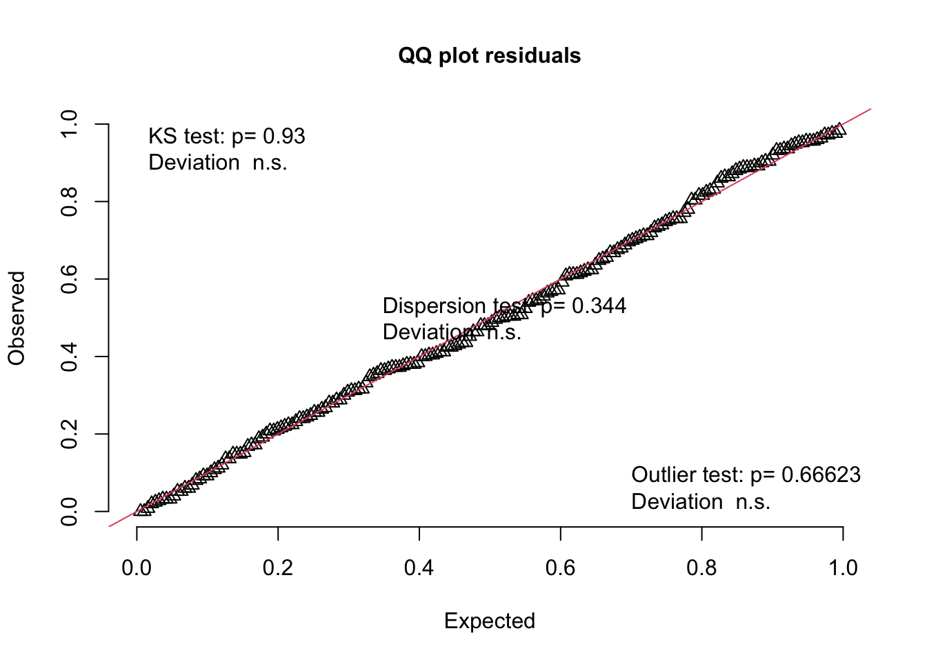 Note that the plot is the observed vs. expected scaled residuals. As above, the triangular points will follow the red line in a well-specified model. You will generally assess this by eye, but the DHARMa package also includes three null hypothesis tests that give you more information about the behaviour of your residuals relative to the expected behaviour. In all cases, a low P-value (traditionally P < 0.05) means that there is evidence that the null hypothesis can be rejected (and your error distribution assumption is not valid).30