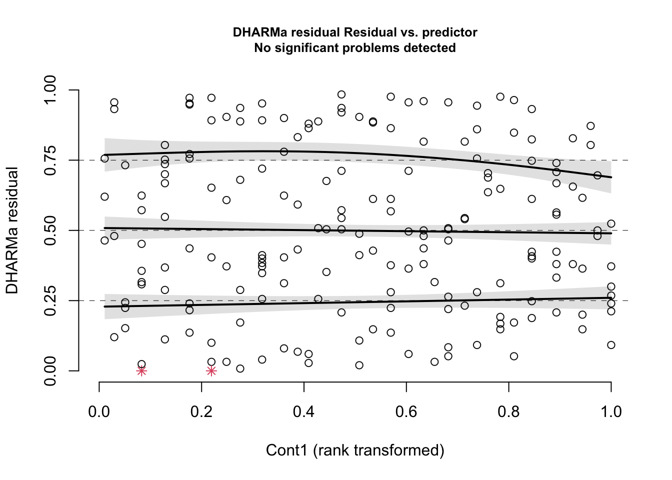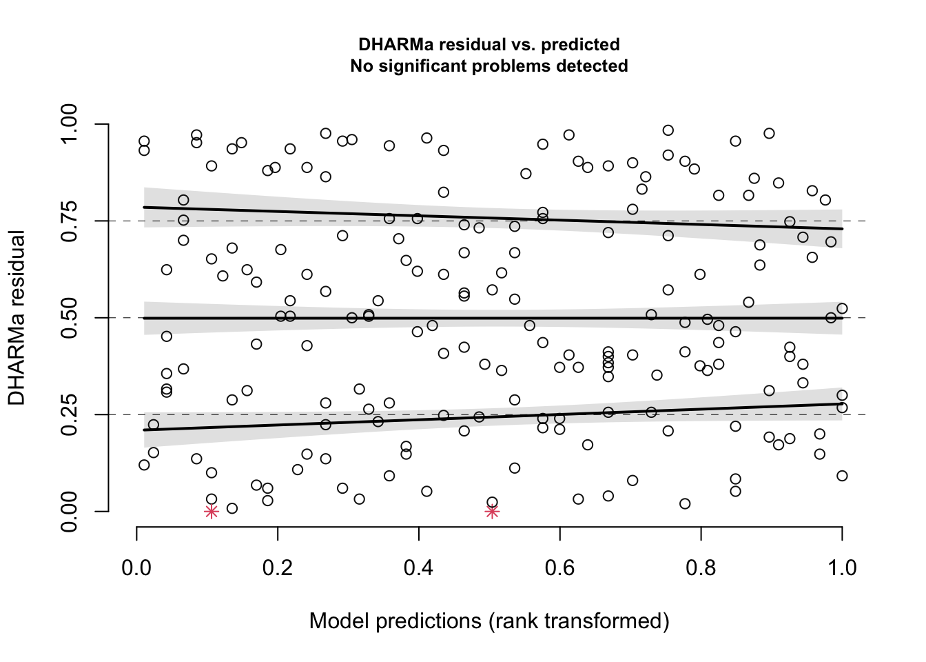 This gives a plot of the scaled residual (“DHARMa residual”) vs. the fitted values (“Model predictions”). Any simulation outliers (data points that are outside the range of simulated values, see also the section above) are highlighted as red stars. You can use the testOutliers() and outliers() function in the DHARMa package to learn more about outliers.