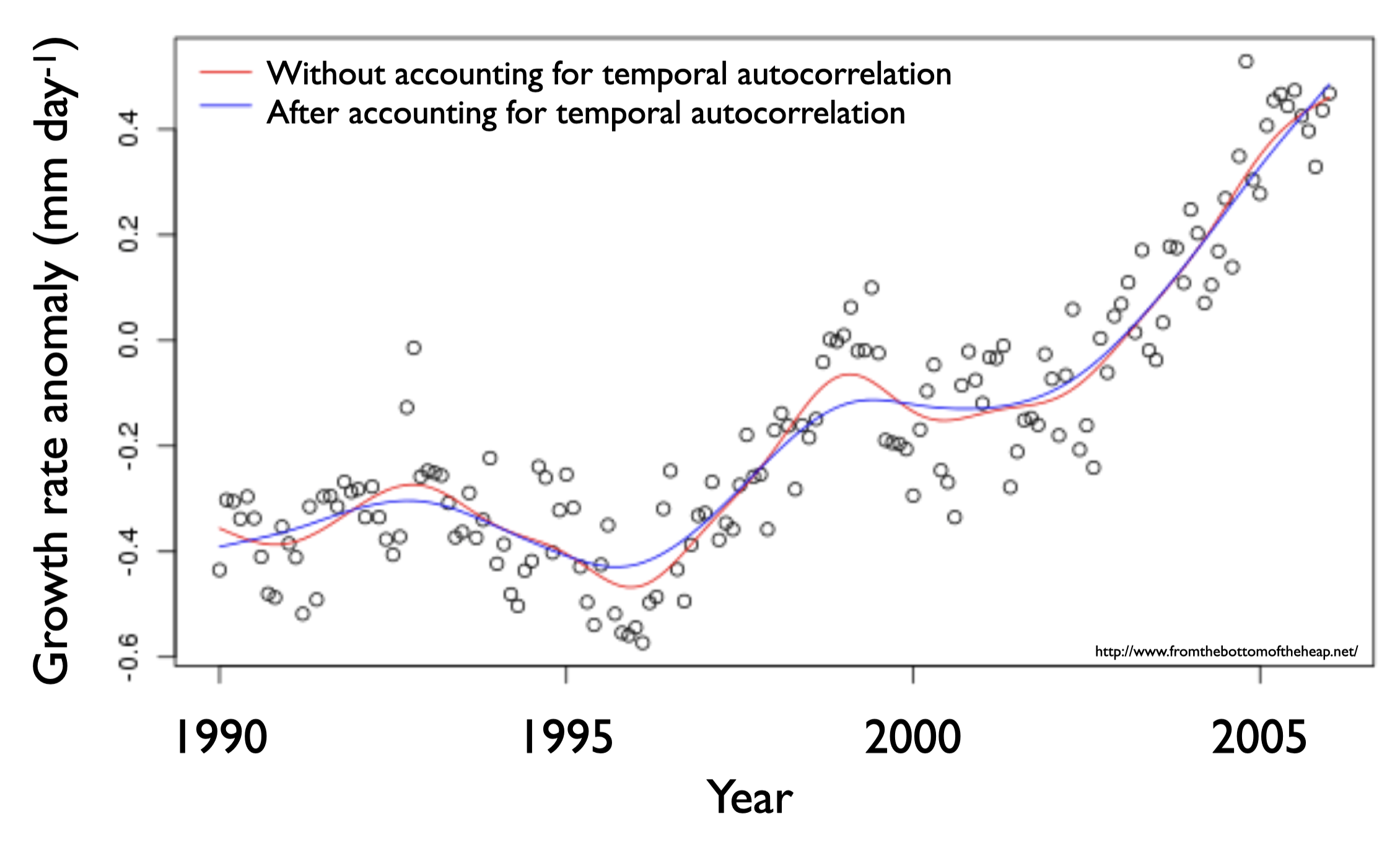 Suppose you want to test the hypothesis that variability in growth rate of newly hatched cod (torsk) in the Kattegat is explained by prey availability (Growth ~ Prey). The observations you are using to test this hypothesis have been collected over ~15 years, and it is likely that measurements made closer to each other in time are more similar than those made further apart from each other in time. This may be because the physical or biological environment was more similar in years that are close to each other in time (e.g. the parent population was similar, the temperature was similar). However, there is nothing in your hypothesis (Growth ~ Prey) to let R know which observations are close to each other in time. Thus, you violate the assumption of observation independence.