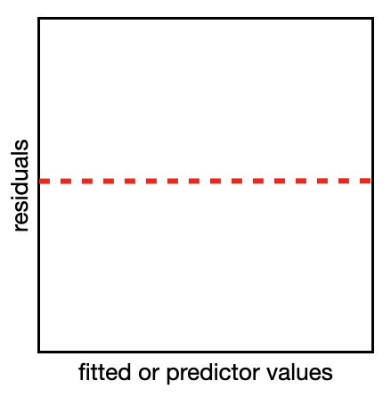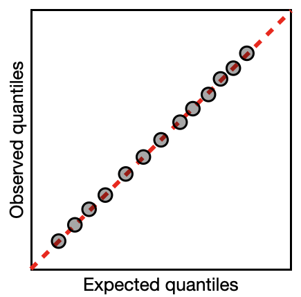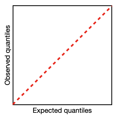 You can compare the error distribution of your residuals with the distribution you expect given your error distribution assumption through something called a Q-Q plot. A Q-Q plot - or quantile-quantile plot - plots the two data distributions against each other via their quantiles29. When the expected and observed error distributions are in agreement, the points will fall along the red diagonal line in the Q-Q plot (the 1:1 line). You can also help your interpretation of this by null hypothesis goodness of fits tests (more on this below).