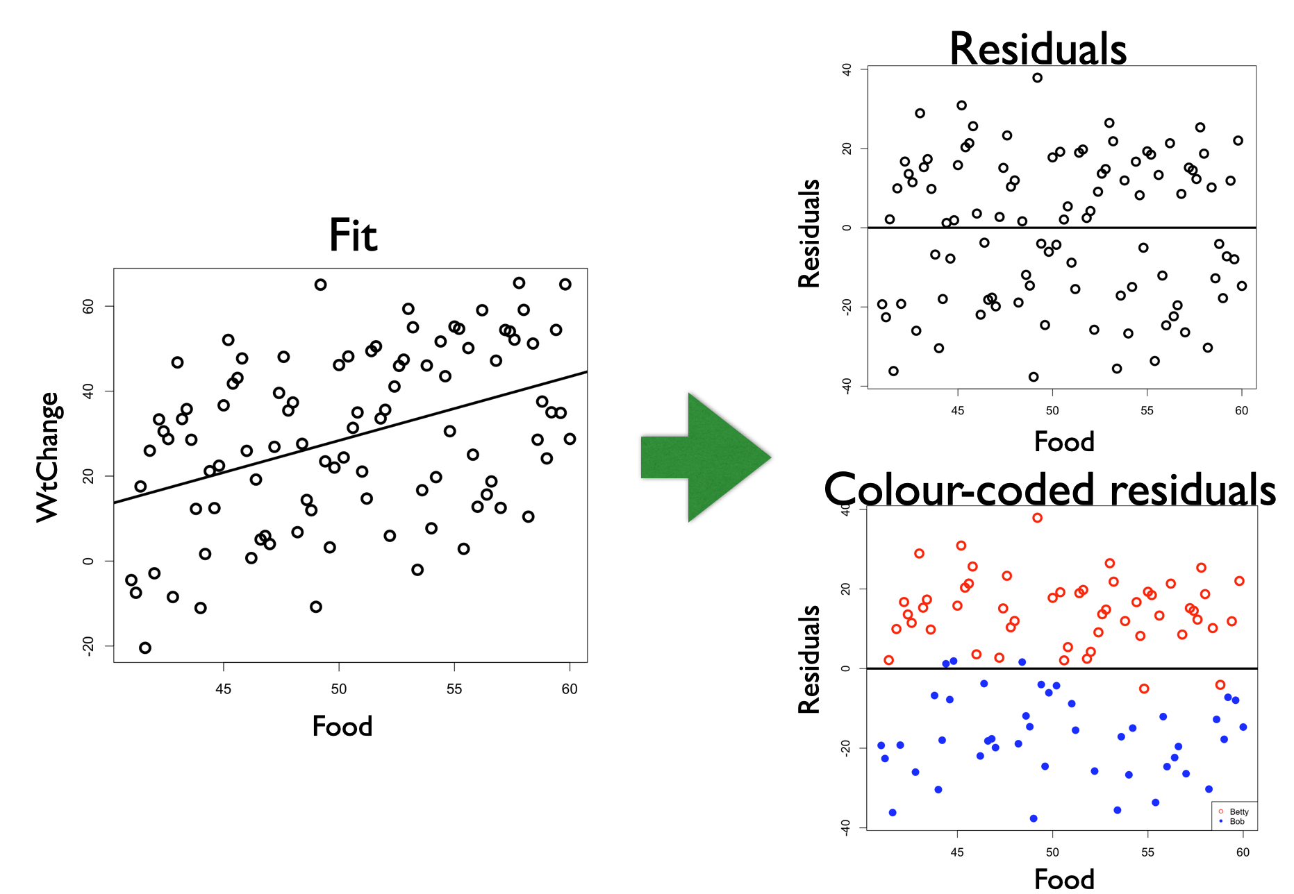 The second type of plot is a residual plot. In the residual plot, you will make plots to compare the residuals (on the y-axis) vs. the model fit and each predictor/variable (on the x-axis). This will let you see if there are any patterns in the plot which could indicate a violation of your model assumptions. If your model is valid, the points will form a uniform cloud of points in your residual plot (like the example on the right).