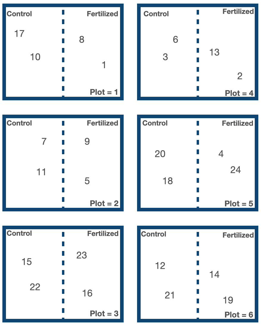 When you add new fixed effects to your hypothesis, your model gets more “expensive” to fit. In the section on Hypothesis Testing, we will discuss how we can quantify the “benefit” of the model (increased explained deviance related to the likelihood of the model) vs. the cost of the model (how many coefficients have to be estimated to fit your model). Adding new fixed effects increases the cost of fitting your model as more coefficients need to be estimated. This increased cost means you need more observations (data) to fit the model. When you add a new continuous predictor to your hypothesis, there is one more coefficient to estimate (in a linear model, this is a slope). When you add a new categorical predictor to your hypothesis, you need to estimate another coefficient for each level in your new predictor. In our example, you would need to estimate 6 - 1 = 521 new coefficients to add the main effect of the Plot variable to the model, and another 6 - 1 = 5 coefficients to add the Fertilizer:Plot interaction to the model.
