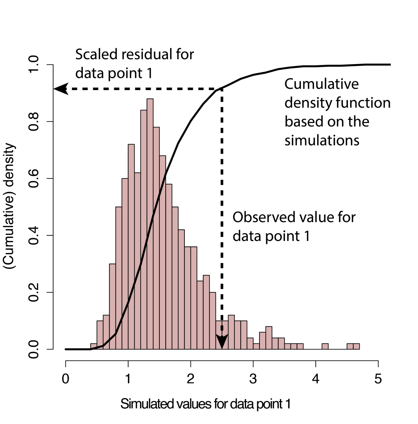 notice I say “can be defined as…”. This is because there are many different definitions of a residual that have been made to deal with different model structures. We are going to use a very useful one - the scaled residual - that will let you explore residuals for a wide range of models. More on this below!↩︎