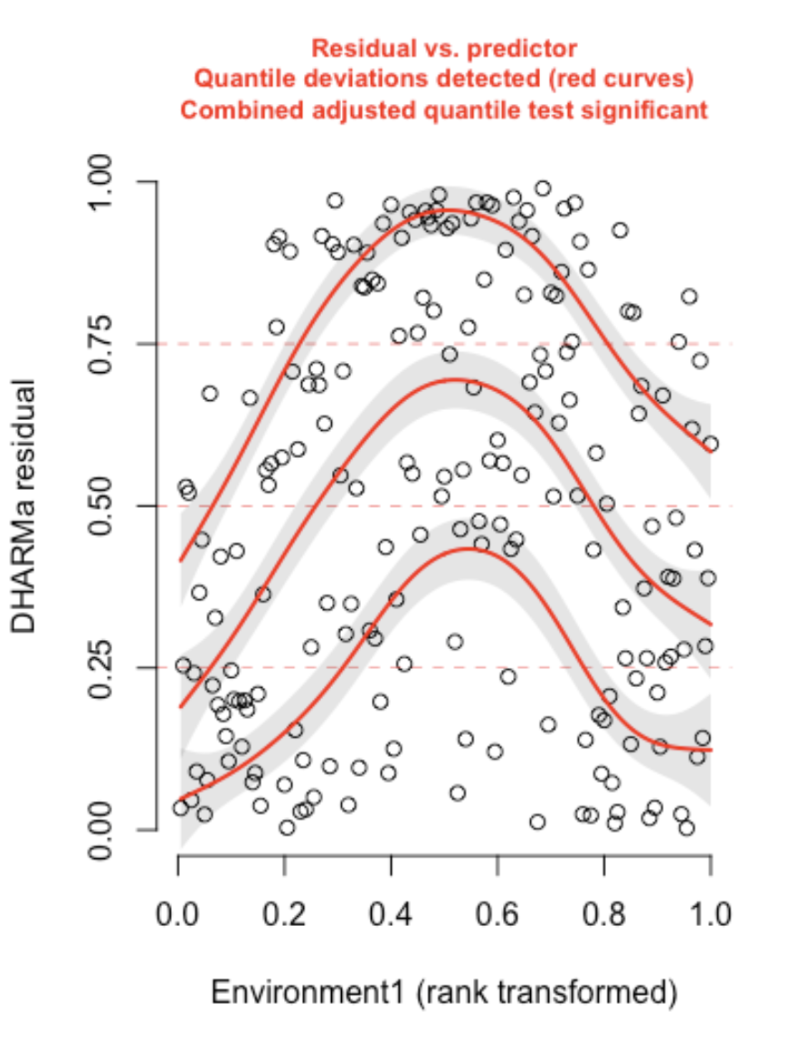 In this case, the predictor Environment1 was fit with an assumption of a linear relationship with the response, when a non-linear shape assumption was needed. Note that you can also access the quantile test used to flag shape assumption violations with the testQuantiles() function in the DHARMa package.