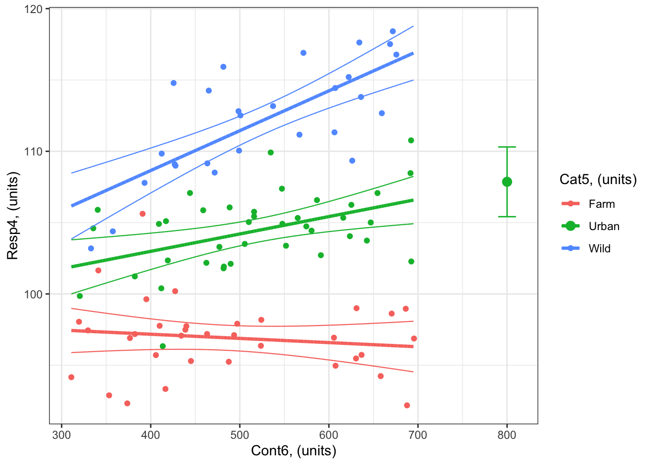 So the value of Resp4 when Cont6 = 800 units for Cat5 = Urban is 107.9 units (95% confidence intervals: 105.4 to 110.3 units).