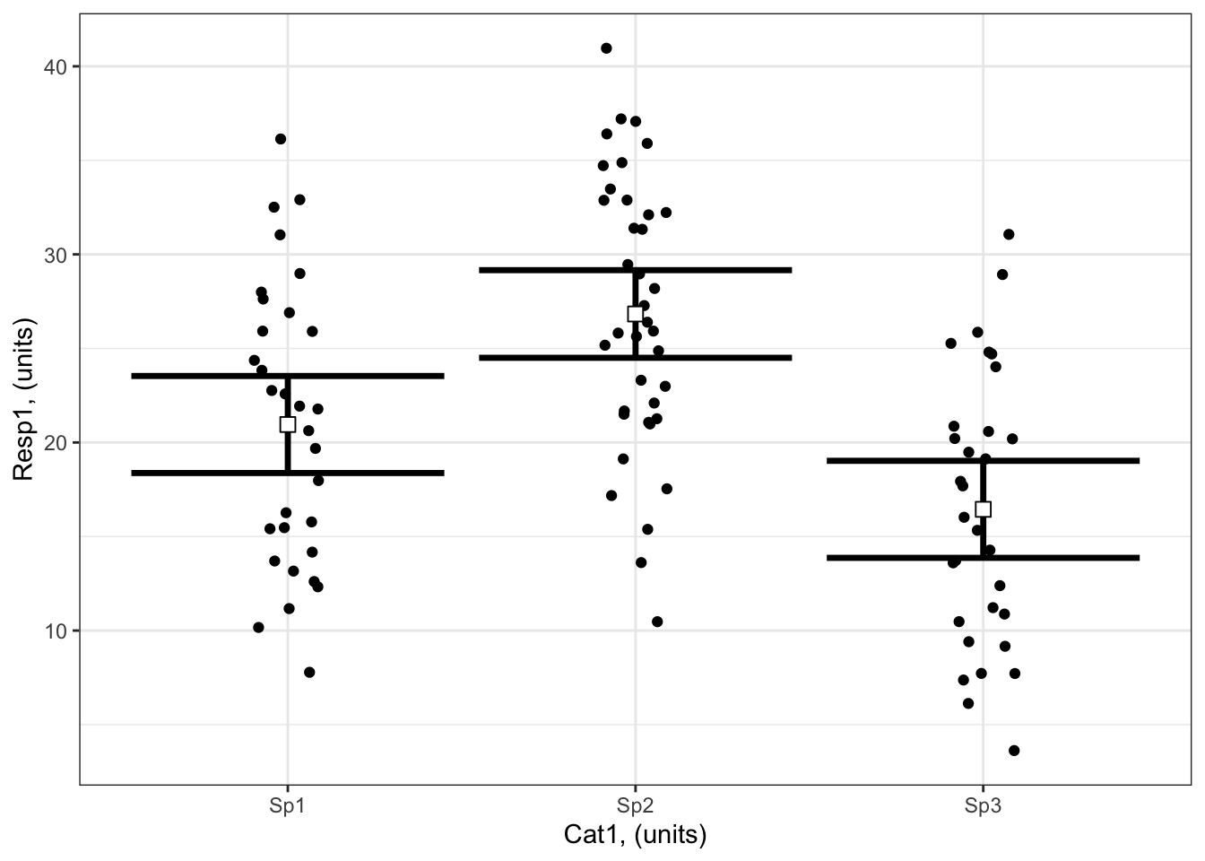 Here you can see the modelled Resp1 when Cat1 is Sp1, Sp2 or Sp3. You are not able to make a prediction for Cat1 = Sp4 or Cat1 = Sp63. This is limits of prediction limit when you have a categorical predictor. You are able to report the variability in Resp1 that is explained by Cat1 - this can give you an idea for how much Resp1 might vary if you study a new species.