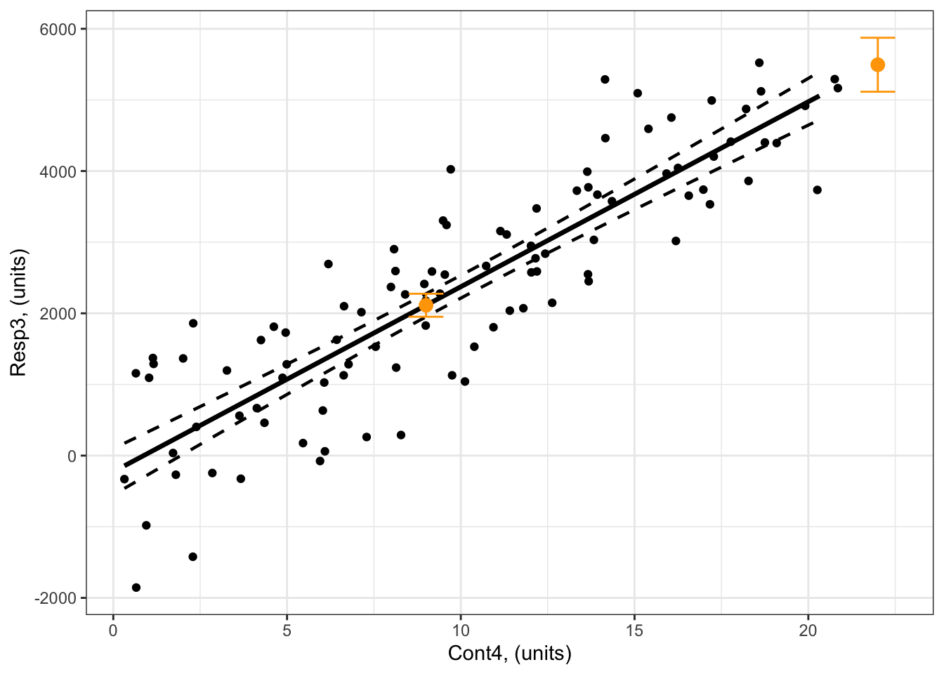 So the value of Resp3 when Cont4 = 30 units is 7575 units (95% confidence intervals: 6980 to 8169 units).