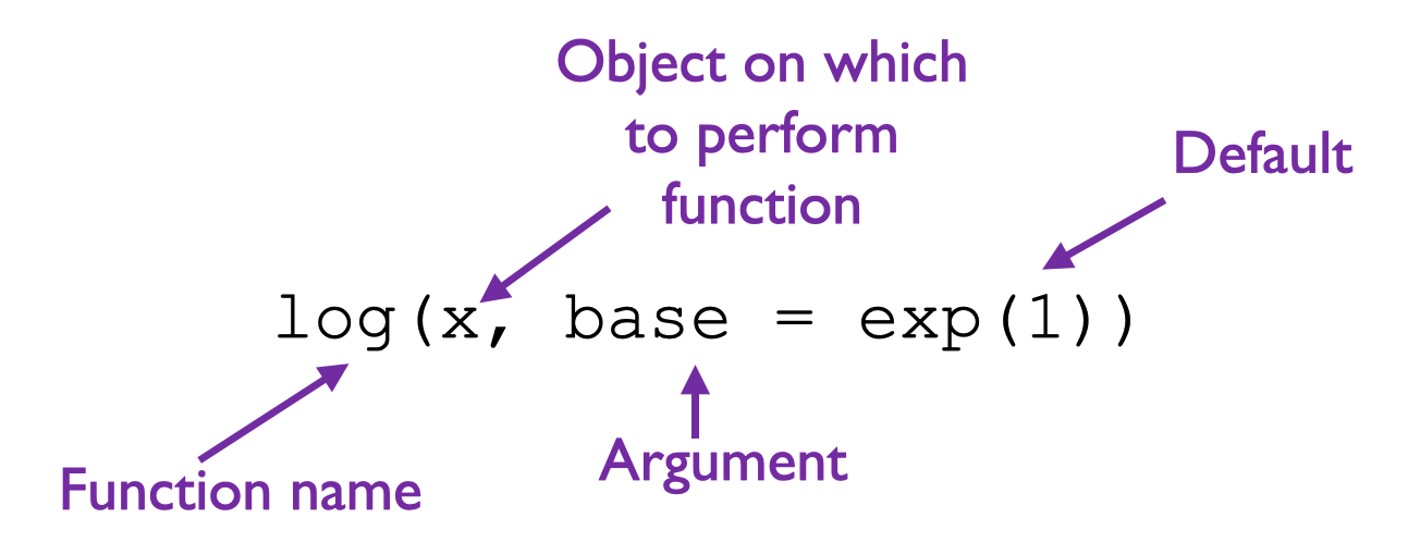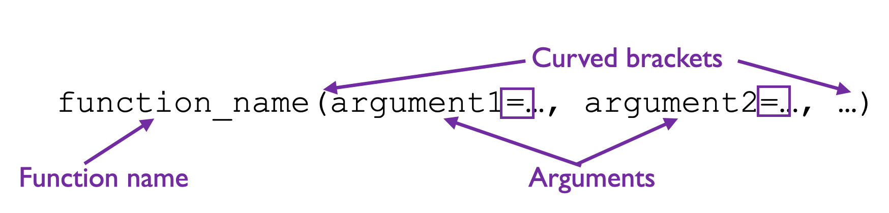 Function name (e.g. sum): This is like the name of your protocol (e.g., “DNA extraction”, “calculate_diversity”). It tells R which operation to perform. Function names are always followed by curved brackets (parentheses) ().
